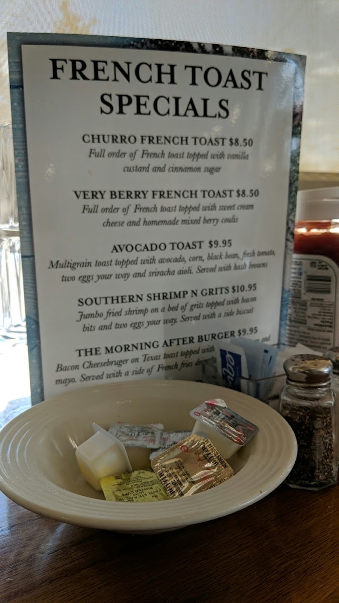 Three pieces of french toast comes sprinkled with powdered sugar and butter and syrup on the side. Add a side of meat for an additional price.