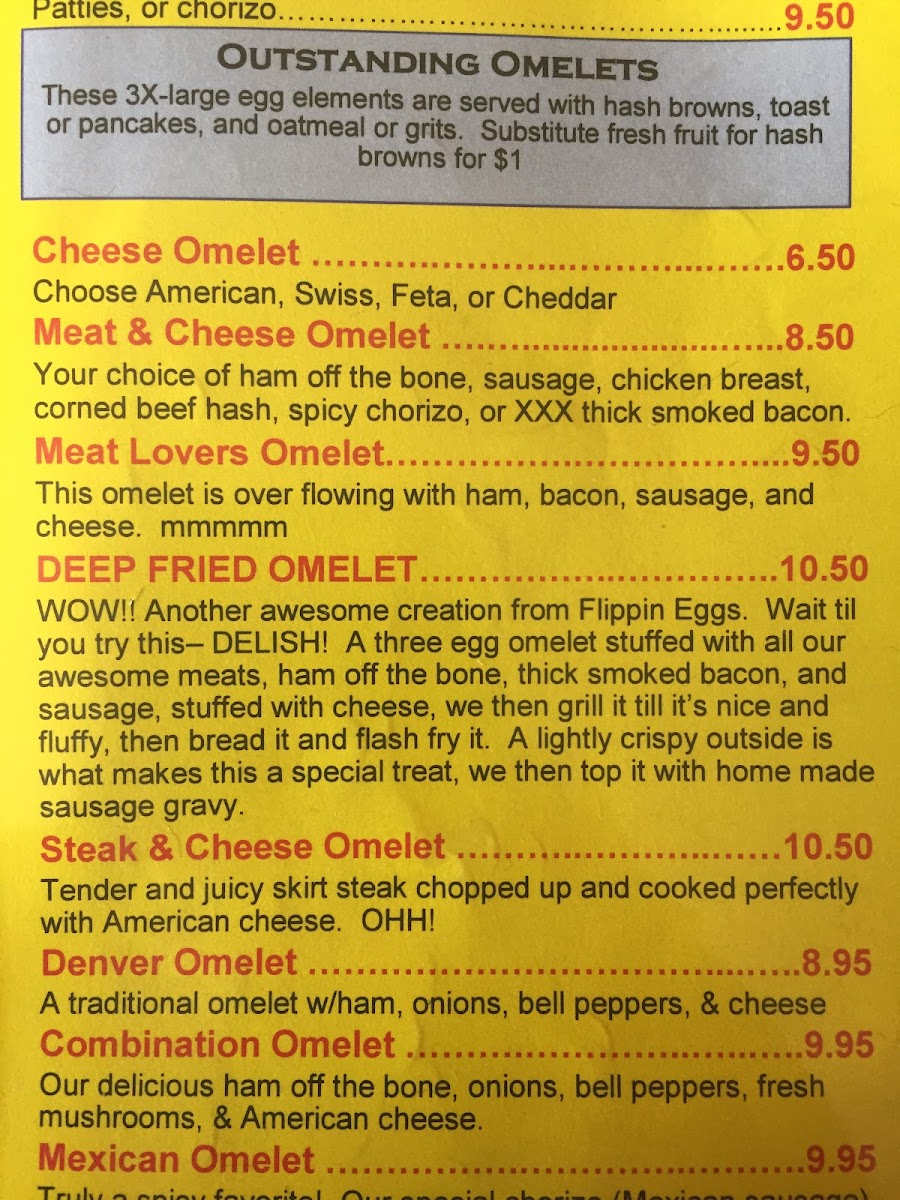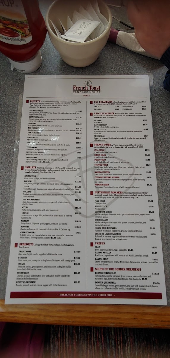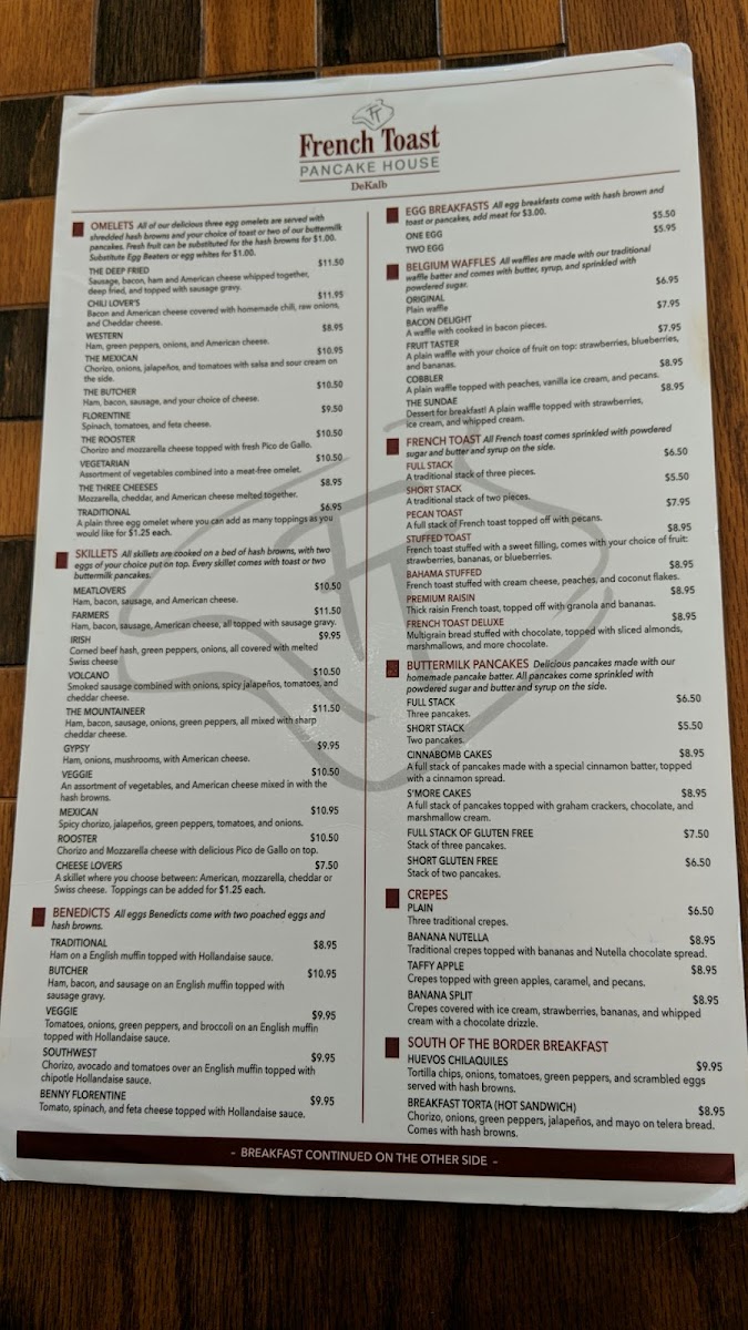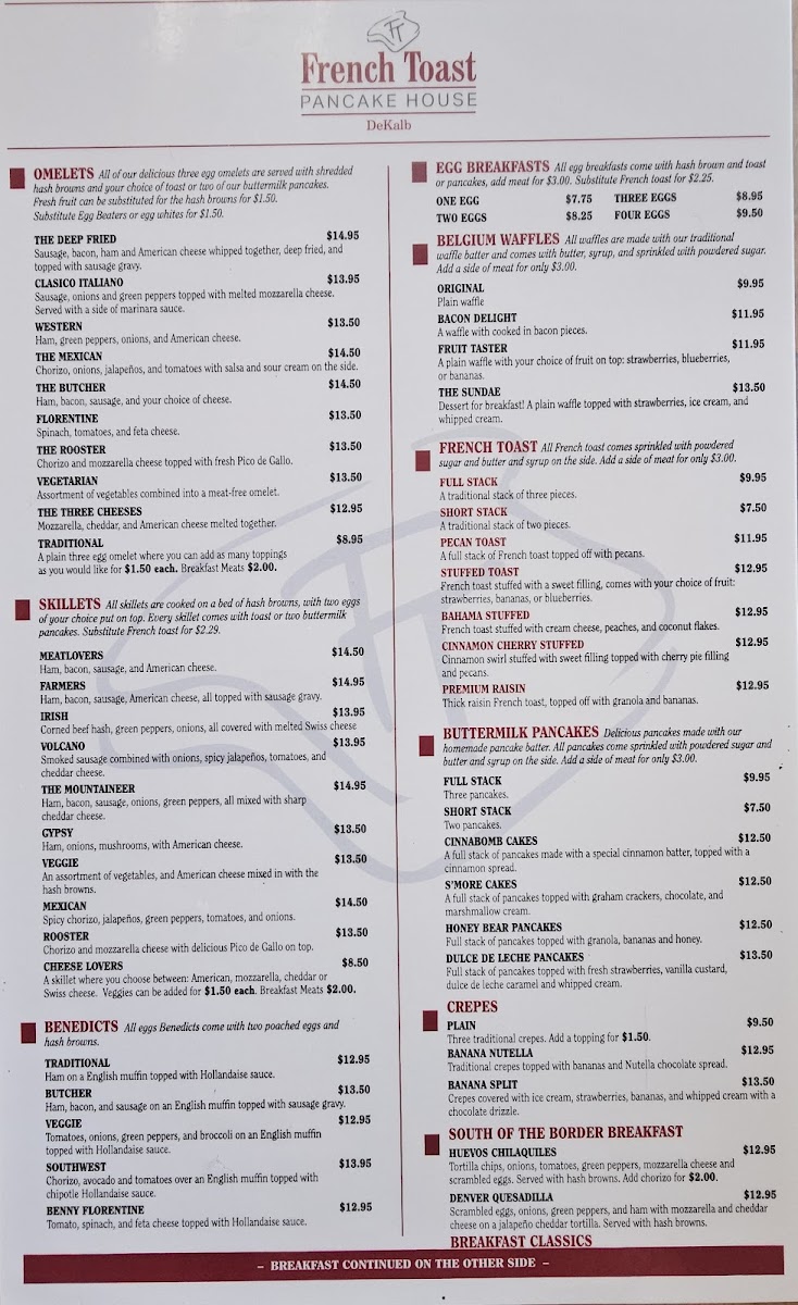 One piece of french toast, two eggs your choice, and your choice of meat.